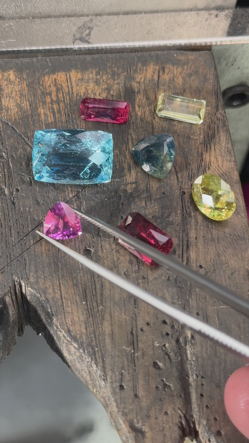 Flame-fused gold plates create the bold setting, which holds a red Tourmaline, an Heliodor, and Diamonds.