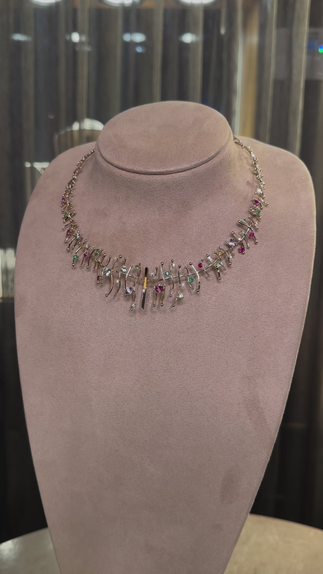 Materials of excellence used: 18kt Gold, Multicolor Sapphires 2.31 ct, Demantoids 0.81 ct, Rubies 0.67 ct, Emeralds 0.38 ct, Rhodolites 0.46 ct, Tsavorites 0.30 ct, and Diamonds 0.21 ct.