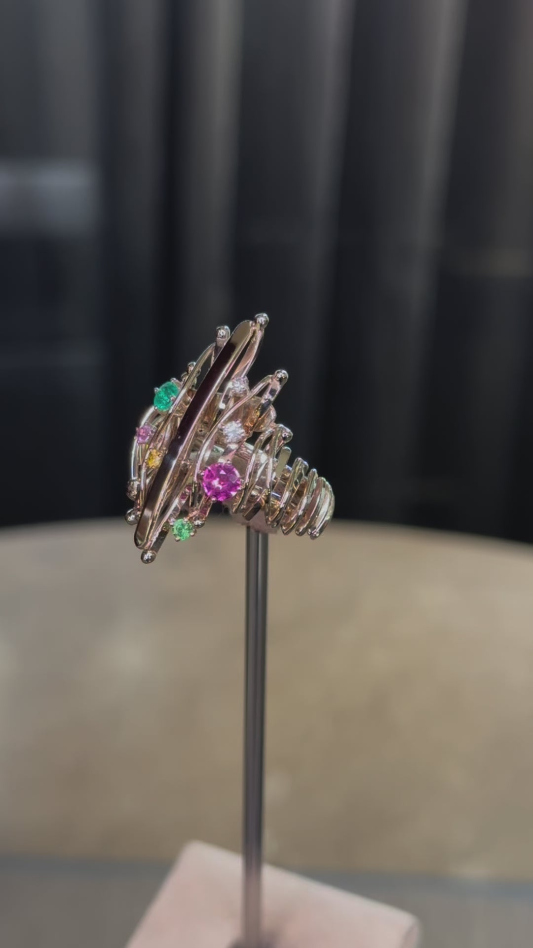 Materials of excellence used: 18kt Gold, Pink and Yellow Sapphires 0.44ct, Emerald 0.17ct, Tsavorite 0.07ct, and Diamonds 0.08ct.