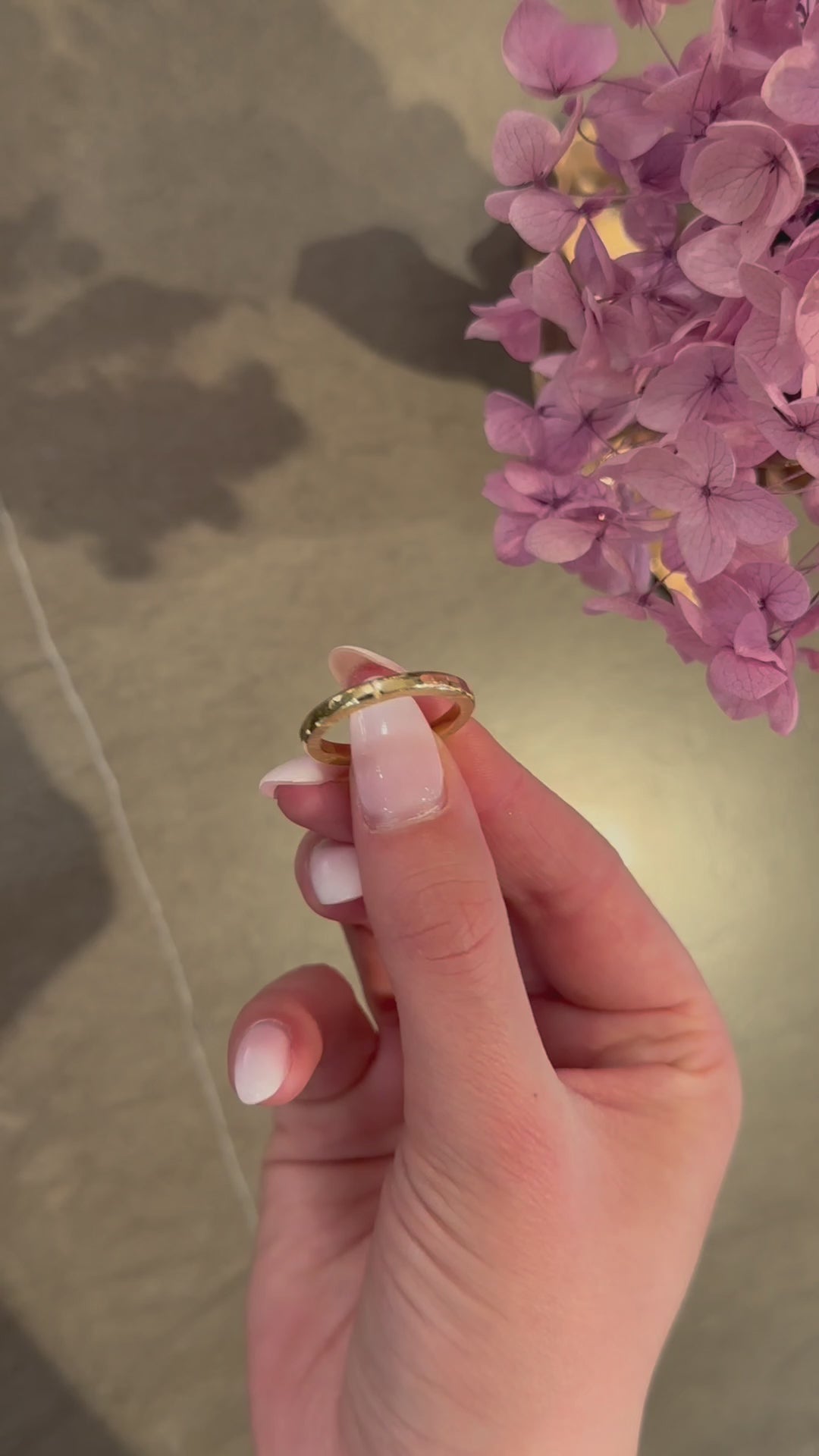 The particular proportions of this wedding band make it special: narrow and tall to be able to engrave the names and the date of the newlyweds on the satin side.